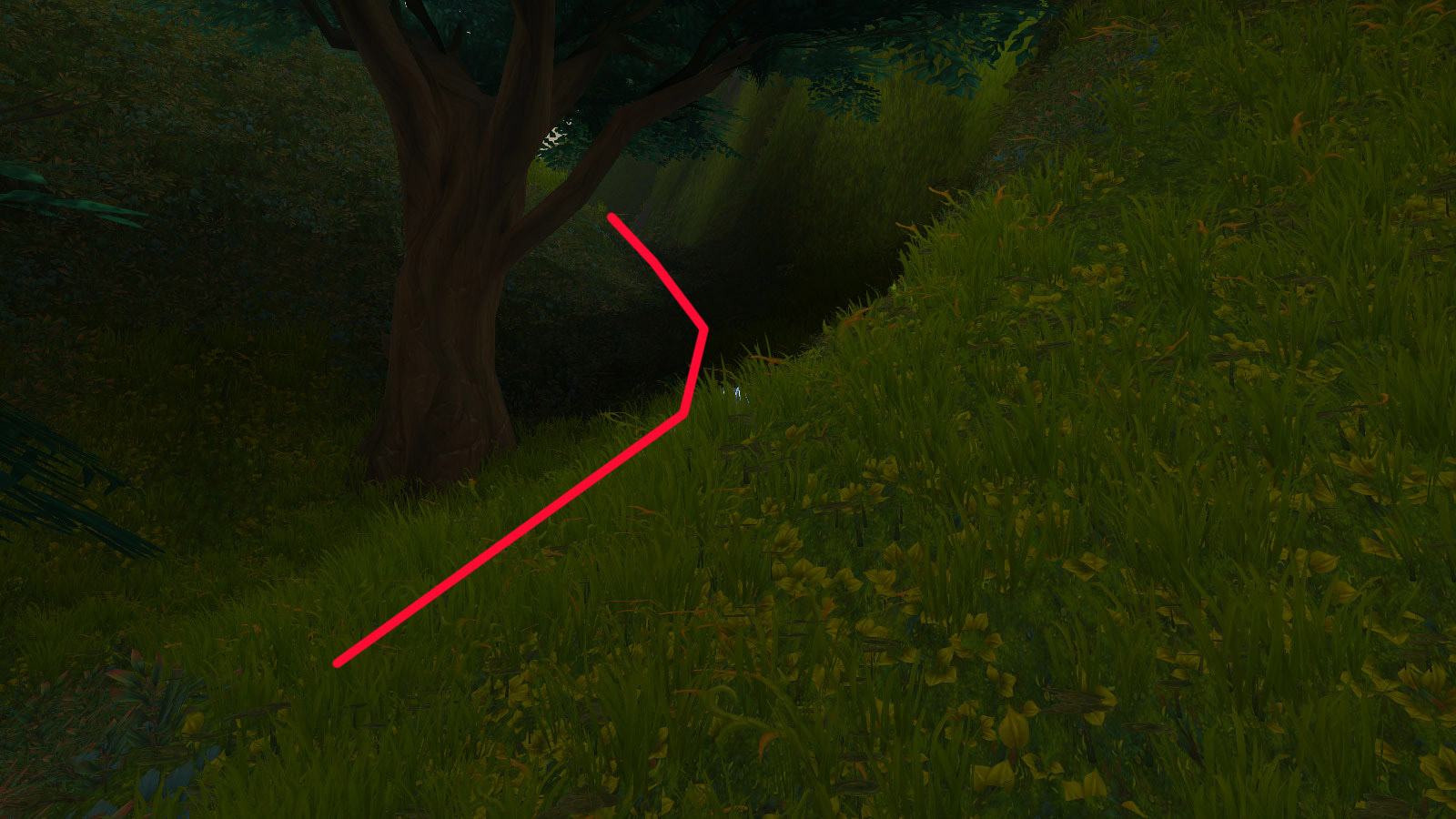 Empruntez cette route jusqu'à atteindre le rare Hakbi le Ressuscité. Passez devant ce dernier et montez les marches de l'escalier. Continuez tout droit. Un petit chemin escarpé dissimulé vous permet de franchir la chute d'eau et d'atteindre une route cachée. Il vous suffit alors d'avancer jusqu'à la chute d'eau. Une fois traversée, vous devez prendre sur la droite et vous glisser tout doucement derrière la structure du bâtiment.